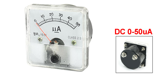 Product Name Analog Ammeter Measuring Current Range DC 0-50uA Accuracy 2.5 Panel Size(Approx) 53 x 53 x 11mm/2.1" x 2.1" x 0.43"(L*W*T) Thread Size Big One: 4 x 8cm / 0.16" x 0.31"(D*L)