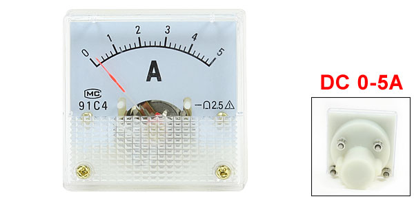 Product Name Analog Ammeter Model 91C4 Measuring Current Range DC 0-5A Accuracy Class 2.5 Total Size 4.5 x 4.5 x 3.5cm/1.8" x 1.8" x 1.4"(L*W*T) Screw Mounting Size 3 x 8mm/0.12" x 0.315"(D*H)