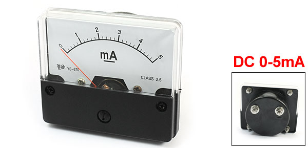 Product Name Analog Ammeter Measuring Current Range DC 0-5mA Accuracy 2.5 Panel Size(Approx) 72 x 62 x 11mm/2.8" x 2.4" x 0.43"(L*W*T) Thread Size Big One: 4 x 9.5cm / 0.16" x 0.36"(D*L)