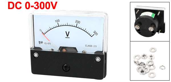 Product Name Analog Voltmeter Measuring Current Range DC 0-300V Accuracy 2.5 Panel Size(Approx) 72 x 61 x 13mm/2.8" x 2.4" x 0.5"(L*W*T) Thread Size 3 x 12mm / 0.12" x 0.47"(D*L)
