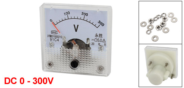 DetailsDC 0 to 300V Measuring Range Class 5.0 Accuracy Panel Gauge Voltmeter  Product Name Analog Voltmeter Model 91C4 Measuring Voltage Range DC 0 - 300V Accuracy Class 5.0 Meter Face Size(Approx) 4.5 x 4.5 x 0.8cm / 1.8" x 1.8" x 0.3"(L*W*T) Thread Size 2.8 x 8mm / 0.1" x 0.31"(Dia.*L) Overall Depth 3.6cm / 1.4" Color White, Clear, Black Net Weight 30g Package Content 1 x Analog Voltmeter