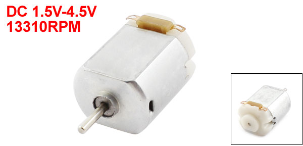 DetailsDC 1.5-4.5V 13310RPM 2x9mm Round Shaft Cylindrical Motor for RC Model Toy  Main Color Silver Tone Brand DMiotech Net Weight 15g Speed 13310RPM Total Length 38mm/1.1" Country of Manufacture CHINA Model 130 Package Content 1 x DC Motor Voltage DC 1.5V-4.5V Shaft Size 2 x 9mm/0.08" x 0.35"(D*L) Material Metal, Plastic, Electronic Parts Body Size 25 x 20 x 15mm/1" x 0.8" x 0.6"(L*W*T)