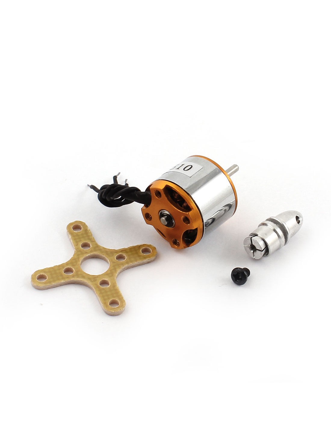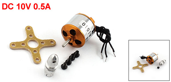 DetailsDC 10V 0.5A 2200KV Brushless Motor for RC Hexacopter Quadcopter  Main Color Silver Tone, Yellow Shaft Diameter 2mm/0.08" Country of Manufacture CHINA Model A1510 Material Metal Fixing Hole Dia 2mm/0.08" Wire Length 50mm/2" Fixing Hole Center Distance 9 x 9mm/0.35" x 0.35"(L*W) Rated DC 10V 0.5A Net Weight 21g Speed 2200KV Package Content 1 x Brushless Motor Motor Size 28 x 18mm/1.1" x 0.71"(L*D) Shaft Length 7.5mm/0.3"