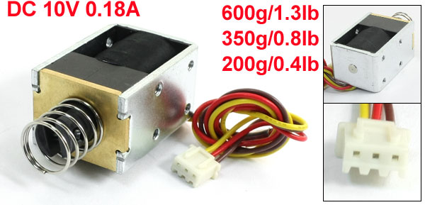 Product Name DC Solenoid Electromagnet Rated Voltage & Current DC 10V 0.18A Power 8.1W Action Form Pull Type Force Stroke: 1mm 600g/1.3lb