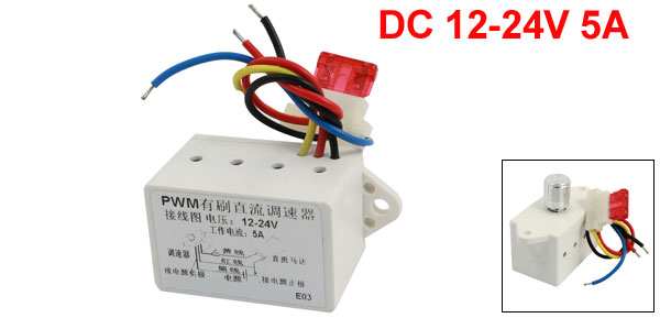 Product Name PWM DC Motor Speed Controller Input Voltage DC 12-24V Rated Current 5A Body Size 55 x 35 x 57mm/ 2.2" x 1.4" x 2.2" (L*W*H) Mounting Hole Size 63mm/ 2.4"(Distance), 5mm/0.2"(Dia.) Material Plastic, Electronic Parts Cable Length 16cm/6.3", 13cm/ 5.1" Main Color White, Silver Tone Wieght 61g Package Content 1 x PWM DC Motor Speed Controller - Reviews
