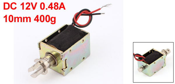 Brand DMiotech Net Weight 152g Rated Voltage DC 12V Country of Manufacture CHINA Package Content 1 x Solenoid Electromagnet Power 5.76W Material Metal Wire Length 8cm/3.2" Stroke Force 10mm 400g Body Size 24 x 29 x 40mm/1" x 1.2" x 1.6"(L*W*T) Current 0.48A - Reviews