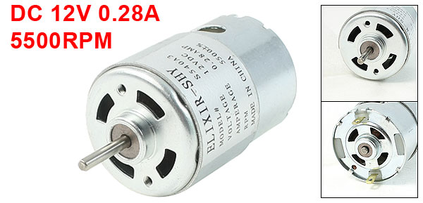 DetailsDC 12V 0.28A 5500RPM High Torque Cylinder Electric DC Motor  Product Name DC Motor Model S540A3 Rated Voltage DC 12V Rated Current 0.28A Speed 5500RPM Mounting Screw Hole Diameter 2.5mm/0.1" Screw Hole Center Distance 25mm/1" Shaft Size 3 x 15mm/ 0.1" x 0.6"(D*L) Body Size 37 x 51mm/ 1.5" x 2" (D*H) Main Color Silver Tone Material Metal Net Weight 159g Package 1 x DC Motor