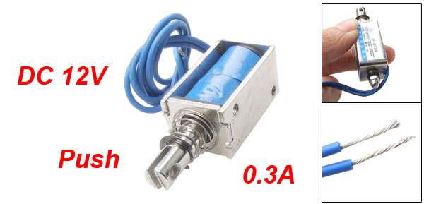 Product Name DC Solenoid Electromagnet Material Metal, Electronic Parts Color Blue, Silver Tone Rated Voltage DC 12V Action Form Push Rated Stroke 10mm, 5N