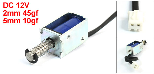 DetailsDC 12V 0.3A 3.6W Push Pull Type 2mm 45gf 5mm 10gf Electromagnet Solenoid  Product Name Open Frame Solenoid Electromagnet Rated Voltage & Current DC12V 0.3A Power 3.6W Action Form Push Pull Type Stroke & Force 2mm, 45gf 5mm, 10gf Body Size 20 x 12 x 11mm/ 0.8" x 0.47" x 0.43"(L*W*H) Plunger Size 35 x 4mm/ 1.4" x 0.16"(L*Max.D) Cable Length 9cm/ 3.5" Material Metal, Electronic Parts Weight 14g Package Content 1 x Open Frame Solenoid Electromagnet