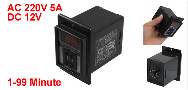 Product Name Time Relay Type ASY-2D Control Voltage DC 12V Frequency 50/60 Hz Contact AC 220V 5A Non-inductive Load Time Range 1-99 Minute Mount Size (Approx.) 60 x 48 x 68mm/ 2.36" x 1.89" x 2.68" (L*W*Depth) Front Face Size 8.5 x 5.7cm / 3.3" x 2.2"(L*W) Mount Hole Diameter 4.5mm/ 0.18" Total Length 8.8cm / 3.5" Main Color Black Net Weight 128g Package Content 1 x Digital Time Relay - Reviews