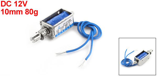 Rated DC 12V Net Weight 38g Country of Manufacture CHINA Package Content 1 x Solenoid Electromagnet Type Pull Push Type Material Metal Wire Length 190mm/7.5" Body Size 57 x 18 x 16mm/2.3" x 0.71" x 0.63"(L*W*T0 Stroke & Force 10mm 80g - Reviews