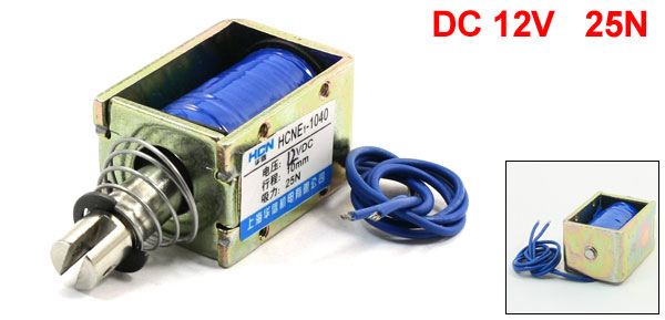 Product Name DC Solenoid Electromagnet Model HCNE1-1040 Rated Voltage DC 12V Action Form Pull Type Rated Stroke 10mm, 25N Body Size(Approx) 40 x 29 x 24mm / 1.6" x 1.1" x 0.94" (L*W*H) Cylinder Size(Approx) 42 x 10mm / 1.7" x 0.4" (L*D) Cable Length(Approx) 22cm / 8.7" (Each) External Material Metal, Electronic Parts Main Color Silver Tone, Blue Weight 139g Package Content 1 x DC Solenoid Electromagnet - Reviews