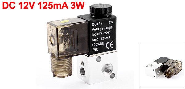 DetailsDC 12V 125mA 3W 1/8"PT Thread 2 Position 3 Way Electric Control Solenoid Valve  Product Name Solenoid Valve Model 3V1-06 Type 2 Position 3 Way Motion Type Direct Drive Type Voltage DC12V Voltage Range DC 12-22V Amp 125mA Power 3W Operating Pressure 0-10kgf/cm2 Thread Hole Size 1/8"PT Hex Connector Inner Dia(Approx) 11mm / 0.43" Overall Size (Approx.) 65 x 57 x 21mm / 2.6" x 2.2" x 0.82"(L*W*T) Material Aluminum Alloy, Plastic Net Weight 134g Package Content 1 x Solenoid Valve