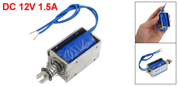 Product Name DC Solenoid Electromagnet Type MR-1253B Rated Voltage DC 12V Rated Current 1.5A Action Form Push Rated Stroke 10mm, 0.8kg Body Size(Approx) 5.2 x 3.1 x 2.7cm / 2.0 "x 1.2" x 1.1" (L*W*H) Cylinder Size(Approx) 8.5 x 1cm / 3.3" x 0.4" (L*D) Cable Length(Approx) 22cm / 8.6" (Each) External Material Metal, Electronic Parts Main Color Silver Tone Weight 202g Package Content 1 x DC Solenoid Electromagnet - Reviews