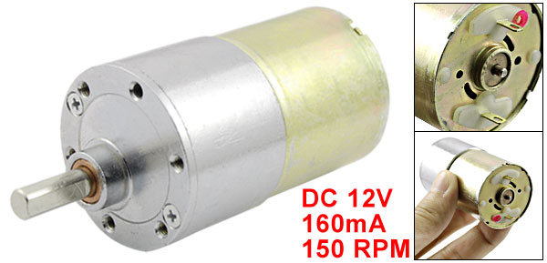 Product Name Gear Motor Rated Voltage DC 12V Rated Current 160mA Rated Torque 2.04Kg.cm Rated Speed 150 RPM Shaft Size 15 x 6mm/0.6" x 0.24" (L*D) Motor Body Length 58mm/2.3" Motor Body Diameter 37mm/1.46" Thread Diameter 2.5mm/0.1" Total Length(Included Pin) 85mm/3.35" Material Metal, Electronic Parts Color Gold Tone, Silver Tone Weight 193g Package Content 1 x Gear Motor - Reviews