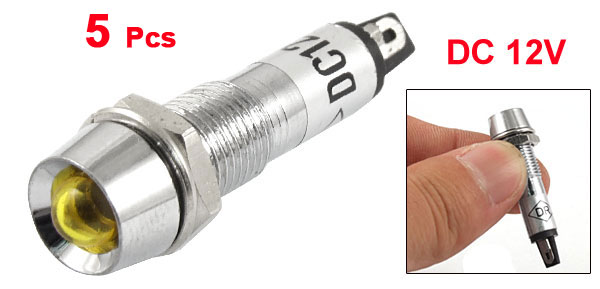 DetailsDC 12V 2 Pins 7.6mm Terminals Yellow Light Signal Indicator Lamp 5 Pcs  Product Name Indicator Pilot Light Voltage DC 12V Pin Number 2 Material Metal, Electric Components Light Color Yellow Thread Diameter 7.6mm/0.3'' Pin Distance(Approx.) 0.2cm/0.08'' Size 3.8 x 1.1cm/1.5'' x 0.4'' (L*Head Dia.) Net Weight 35g PakcageContent 5 Pcs x Indicator Pilot Light