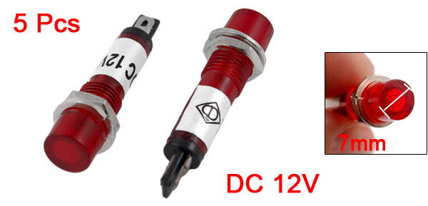 Protduct Name Indicator Lamp Light Color Red External Material Plastic Voltage Power DC 12V Mounting Hole Diameter 7mm/ 0.275" Pin Size 5 x 2.5mm/ 0.19" x 0.09"(L*W) Total Size 36 x 7mm/ 1.4" x 0.3" (H*Top Dia) Shell Color Red Net Weight 16g Package 5 x Indicator Lamps - Reviews