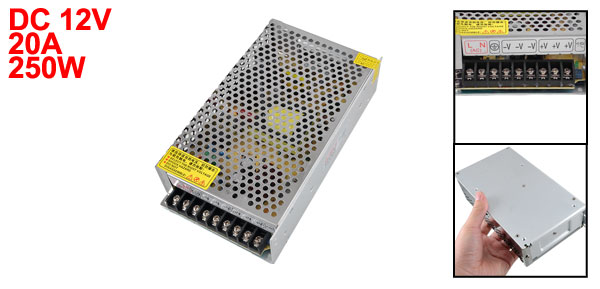 DetailsDC 12V 20A 250W Metal Housing 9 Pins Switching Power Supply Converter HX-250A-12  Item Name Switching Power Supply Model No. HX-250A-12 Input AC 100-120V 60Hz AC 200-240V 50Hz Output DC 12V, 20A DC Output Power 250W Terminal Quantity 9 Total Size 19.5 x 10.7 x 4.9cm/ 7.7" x 4.2" x 1.9" (L*W*T) Case Material Metal Main Color Silver Tone Net Weight 652g Package Content 1 x Switching Power Supply