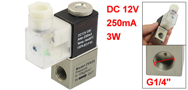 Type 2 Way 2 Position Single Head Type Power Consumption DC 12V 250mA 3W Working Pressure 0-10kgf/cm2 Temperature 60C Joint Bore Size(Approx) Inlet=Outlet=G1/4" Threaded Port Size(Approx) Air Inlet=Air Outlet=13mm Hex Connector Inner Dia(Approx) 15.5mm/ 0.61" Mount Thread Diameter 3.5mm/ 0.14" Overall Size(Approx) 7.7 x 2.2 x 6cm/ 3" x 0.87" x 2.4" (L*W*H) Color Silver Tone, Black Indicator Color Green External Materila Plastic, Alloy Net Weight 139g Package Content 1 x Solenoid Valve - Reviews