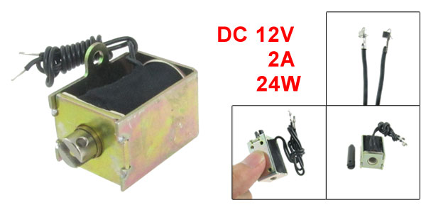 Product Name Open Frame Solenoid Material Metal, Electronic Parts Rated Voltage DC 12V Current 2A Power 24W Action Form Pull Type Rated Stroke & Force 5mm, 0.35Kg(Primary)