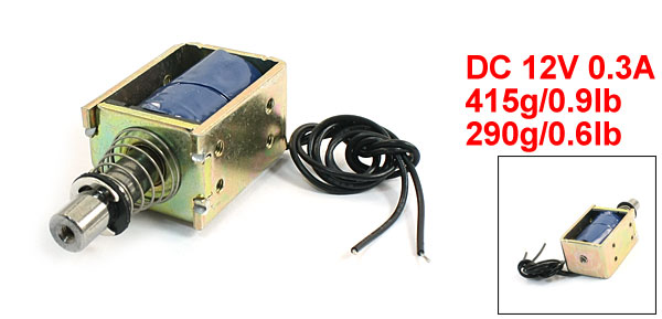 Product Name DC Solenoid Electromagnet Rated Voltage & Current DC 12V 0.3A Power 3.6W Action Form Push Pull Type Force Stroke: 2mm 415g/0.9lb