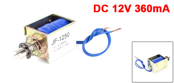 Product Name DC Solenoid Electromagnet Type JF-1250 Rated Voltage DC 12V Rated Current 360mA Action Form Pull Rated Stroke 10mm, 60N/6Kg Body Size(Approx) 50 x 37 x 40mm / 2"x 1.5" x 1.6" (L*W*H) Rod Dia 12mm / 0.5" Cable Length(Approx) 17cm / 1.6" External Material Metal, Electronic Parts Main Color Gold Tone, Blue Weight 356g Package Content 1 x DC Solenoid Electromagnet - Reviews