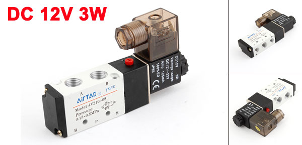 Product Name Solenoid Valve Model No. 4V210-08 Working Pressure 0.15~0.8MPa Type 5 Way 2 Position Power Consumption DC 12V 3W Voltage Range DC 12V-22V Current 125mA Hex Part Dia. 19mm / 0.75" Threaded Port Size(Approx.) Big: 11.44mm / 1/4"PT