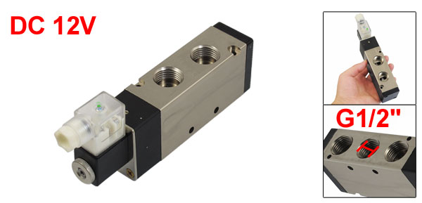 Type 5 Way 2 Position Single Head Type Power Consumption DC 12V 3W 250mA Working Pressure 1.5-8kgf/cm2 Temperature 60C Joint Bore Size(Approx) Air Input=Air Output=Exhaust=G1/2" Threaded Port Size(Approx) Air Input=Air Output=Exhaust=21mm Hex Connector Inner Dia(Approx) 15.5mm/ 0.61" Fix Hole Diameter 4.5mm/ 0.18", 5.5mm/ 0.22" Overall Size(Approx) 17.7 x 3.4 x 7.1cm/ 7" x 1.3" x 2.8" (L*W*H) Color Silver Tone, Black Indicator Color