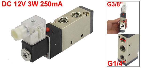 Type 5 Way 2 Position Single Head Type Power Consumption DC 12V 3W 250mA Working Pressure 1.5-8kgf/cm2 Temperature 60C Joint Bore Size(Approx) Air Input=Air Output=G3/8", Exhaust=G1/4" Threaded Port Size(Approx) Air Input=Air Output=16mm, Exhaust=13mm Hex Connector Inner Dia(Approx) 15.5mm/ 0.61" Fix Hole Diameter 4.5mm/ 0.18" Overall Size(Approx) 14.5 x 2.7 x 6.7cm/ 5.7" x 1.1" x 2.6" (L*W*H) Color Silver Tone, Black Indicator Color