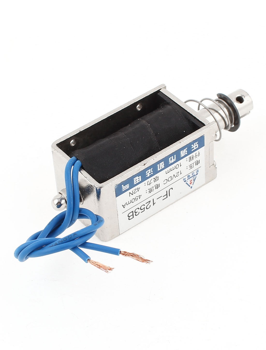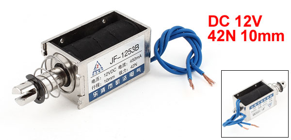 Product Name Open Frame Solenoid Electromagnet Model JF-1253B Rated Voltage DC12V Action Form Pull Type Stroke & Force 10mm, 42N Current 450mA Body Size 53 x 31 x 27mm/ 2.1" x 1.2" x 1.1"(L*W*H) Plunger Size 90 x 10.5mm/ 3.5" x 0.41"(L*Max.D) Cable Length 18cm/ 7.1" Material Metal, Electronic Parts Weight 200g Package Content 1 x DC Solenoid Electromagnet - Reviews