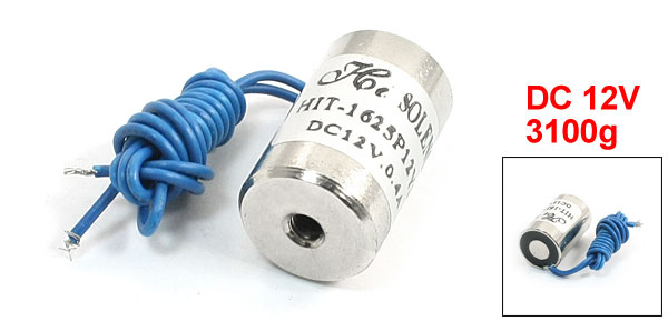 Product Name Electromagnet Type Sucked Type Material Metal, Electronic Parts Rated Voltage DC 12V Rated Current 0.4A Power 4.8W Attraction 3100g/6.8lb Power On Type Intermittent 10% Max Power On Time 2 Second Overall Size 16 x 25mm / 0.63" x 1"(Dia.*T)