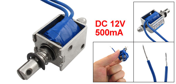 Product Name DC Solenoid Electromagnet Type MR-0520B Rated Voltage DC 12V Rated Current 500mA Action Form Push Rated Stroke 7mm, 0.04kg Body Size(Approx) 2 x 1.6 x 1.3cm / 0.8"x 0.6" x 0.5" (L*W*H) Cylinder Size(Approx) 4.5 x 0.6cm / 1.7" x 0.2" (L*D) Cable Length(Approx) 22cm / 8.6" (Each) External Material Metal, Electronic Parts Main Color Silver Tone Weight 23g Package Content 1 x DC Solenoid Electromagnet - Reviews