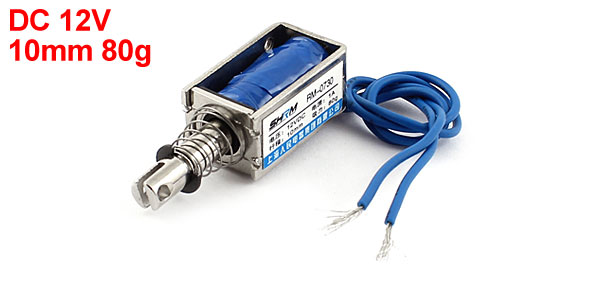 Product Name DC Solenoid Electromagnet Model RM-0730 Coil Rated DC 12V 1A Action Form Pull Type Rated Stroke & Force 10mm, 80g Body Size 30 x 17 x 14mm / 1.2" x 0.67" x 0.55" (L*W*H) Cable Length 20cm / 8" Plunger Dia. 6.5mm / 0.25" Plunger Connect Hole Dia. 2.5mm/0.1" Material Metal, Electronic Parts Net Weight 36g Package Content 1 x DC Solenoid Electromagnet - Reviews