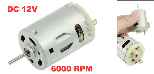 Product Name Motor Rated Voltage DC 12V Rated Speed 6000 RPM Shaft Size 13 x 2.3mm/0.51" x 0.09" (L*D) Motor Body Length 38mm/1.49" Motor Body Diameter 27.5mm/1.08" Mounting Hole Distance(center to center) 15.5mm/0.61" Material Metal, Electronic Parts Color Silver Tone Weight 64g Package Content 1 x Motor - Reviews