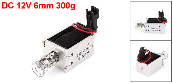 Main Color Silver Tone, Black Brand DMiotech Country of Manufacture CHINA Cable Length 9cm/ 3.5" Model 0837L-12A17.6 Power 8.18W Stroke 6mm Material Metal, Electronic Parts Electrified Rate 50% Force 300g/ 0.66lb Net Weight 98g Rated Voltage DC 12V 0.68A Package Content 1 x DC Solenoid Electromagnet Plunger Size 43 x 8mm/ 1.7" x 0.3"(L*D) Body Size 37 x 26 x 22mm/ 1.5" x 1" x 0.9"(L*W*H) - Reviews