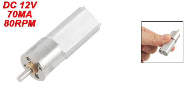 Product Name DC Geared Motor Rated Voltage DC 12V Rated Current 70MA ( no load ) Speed 80 RPM Shaft Diameter 3mm/ 0.118" Gearbox Size 27 x 16 x 12mm/ 1.06" x 0.63" x 0.47"(W*L*T) Overall Size 16 x 55mm/ 0.63" x 2.2" (D*L) Main Color Gray Material Metal Weight 29g Package 1 x DC Geared Motor - Reviews