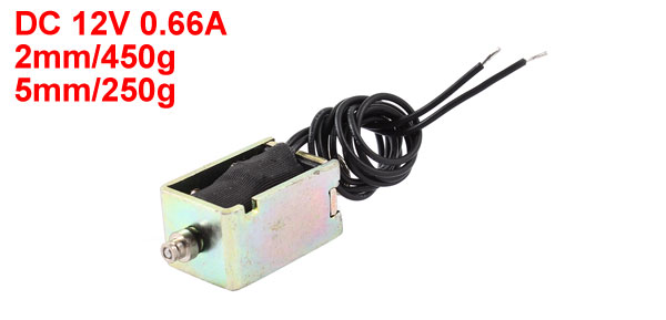 5mm/250gConnection Rates 50% Body Size 30 x 19 x 16mm/ 1.2" x 0.75" x 0.63"(L*W*H) Plunger Size 46 x 9mm/ 1.8" x 0.35"(L*Max.D) Cable Length 30cm/ 11.8" Material Metal, Electronic Parts Weight 48g Package Content 1 x DC Solenoid Electromagnet - Reviews