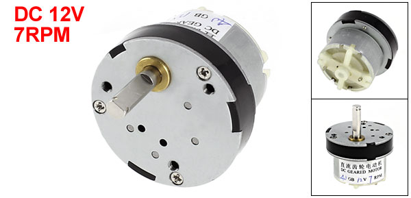 Product Name DC Geared Motor Rated Voltage DC 12V Output Speed 7RPM Mounting Screw Hole Diameter 2.6mm/0.1" Gearbox Size 40 x 10mm/1.6" x 0.39"(D*H) Shaft Size 5 x 18mm/ 0.2" x 0.7"(D*L) Body Length 34mm/ 1.3" Total Length 52mm/ 2.1" Main Color Silver Tone Material Metal Net Weight 94g Package 1 x DC Geared Speed Reduce Motor - Reviews