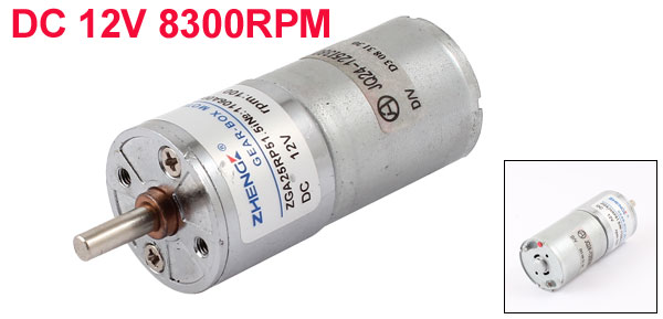 DetailsDC 12V 8300RPM Speed Reduce Electric Geared Box Motor for DIY Toys  Product Name DC Geared Motor Rated Voltage DC 12V Motor Speed 8300 RPM Gearbox Speed 100RPM Shaft Diameter 4mm/ 0.16" Shaft Length 12mm/0.47" Motor Part Size 24 x 30mm/0.94" x 1.2"(D*H) Overall Size 25 x 67mm/ 1" x 2.6" (D*H) Main Color Silver Tone Material Metal Weight 56g Package 1 x DC Geared Motor