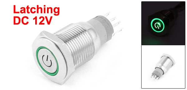 Item Name Push Button Switch Action Type Latching Type LED Type Angel Eye Head Shape Flat Head Contact 1NO 1NC, SPDT Switch Rating AC 250V, 3A Lamp Voltage DC 12V LED Color Green Pin Number 5 Thread Diameter 16mm/0.63" Total Size 38 x 19mm/1.5" x 0.75"(L*Max.W) Material Metal, Plastic, Electric Parts Housing Color Silver Tone, Green Net Weight 15g Package Content 1 x Push Button Switch - Reviews