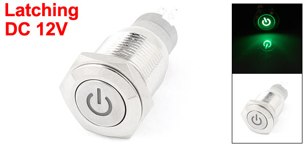 DC 12V Green LED SPDT 16mm Thread Latching Type Metal Push Button Switch