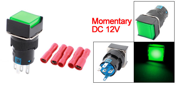 Item Name Square Head Push Button Switch w Crimp Connector Model LA160-16A Contact Type SPDT(1NO 1NC) Action Type Momentary Pin Number 5 Voltage, Current AC 250V 5A Light Voltage DC 12V Thread Dia 16mm/0.63" Total Size(Not Included Pin) 31 x 17 x 17mm /1.2" x 0.67" x 0.67" (L *W *H) Light Color Green External Color Red, Green, Black Material Plastic, Metal Net Weight 11g Package Content 1 x Square Head Push Button Switch
