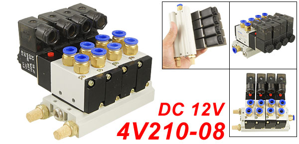 DetailsDC 12V Single Head 2 Position 5 Way 4 Pneumatic Solenoid Valve w Base  Product Name 4 Solenoid Valve w Base Muffler Model 4V210-08 Working Pressure 0.15~0.8Mpa Working Voltage DC 12V Working Power 2.5W Position & Way Number 2 Position 5 Way Base Size 11.5 x 5.7 x 2.4cm/4.5'' x 2.2'' x 0.9'' (L*W*T) Quick Fitting Inner Dia. Solenoid Valve: 0.8cm/5/16'' Base: 0.8cm/5/16'' Muffler Size 1.25 x 2.85cm/ 0.5'' x 1.1'' (Thread D* L) Mounted Hole Dia. 4mm/ 5/32" Total Size 15.3 x 11.7 x 9cm/6'' x 4.6'' x 3.5'' (L*W*H) External Material Metal, Plastic, Brass Color As Picture Shown Net Weight 1079g Package Content 1 x 4 Solenoid Valve w Base Muffler