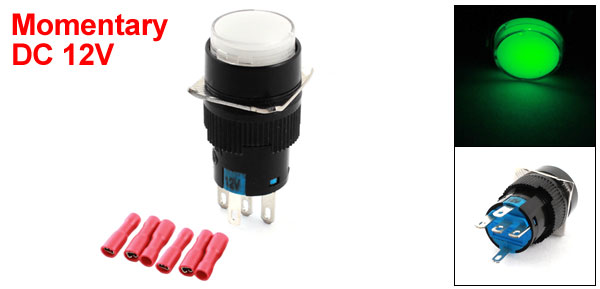 Item Name Round Head Push Button Switch w Crimp Connector Contact Type SPDT(1NO 1NC) Action Type Momentary Pin Number 5 Voltage, Current AC 250V 5A Light Voltage DC 12V Thread Dia 16mm/0.63" Total Size(Not Included Pin) 18.5 x 18 x 33mm /0.73" x 0.71" x 1.3" (L *W *H) Light Color White External Color Black, Blue, White Material Plastic, Metal Net Weight 11g Package Content 1 x Round Head Push Button Switch