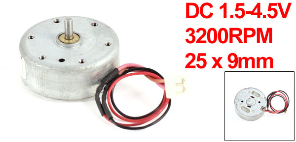 Product Name DC Motor Rated Voltage DC 1.5-4.5V Speed 3200RPM Shaft Diameter 2mm/ 0.08" Shaft Length 5mm/ 0.2" Body Diameter 25 x 9mm/ 1" x 0.35"(D*L) Wire Length 11cm / 4" Main Color Silver Tone Material Metal Weight 18g Package 1 x DC Motors - Reviews