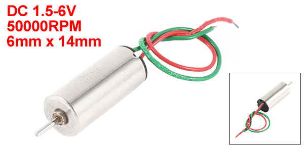 Product Name DC Coreless Motor Rated Voltage DC 1.5-6V Speed 50000RPM Shaft Size 0.8 x 7mm/ 0.03" x 0.3"(D*L) Body Size 6 x 14mm/ 0.24" x 0.55" (D*H) Wire Length 7.5cm/3" Main Color Silver Tone Material Metal Net Weight 3g Package 1 x DC Coreless Motor - Reviews