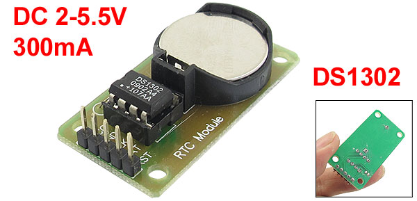 Product Name Time Clock Module Model DS1302 Working Voltage DC 2-5.5V Working Current 300mA Power Supply CR2032 Battery (Not Included Here) Pin Quantity 5 Pin Pin Spacing 2mm/ 0.079" Total Size 44 x 23 x 11.5mm/1.7" x 0.9" x 0.45" (L*W*T) Material Electronic Component, Plastic Net Weight 10g Package Content 1 x Time Clock Module - Reviews