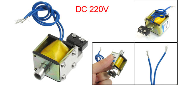 Product Name DC Solenoid Electromagnet Rated Voltage DC 220V Switch Type 1 NO 1 NC Action Form Push Body Size(Approx) 3.3 x 2.9 x 2.4cm / 1.3" x1.1" x 0.9" (L*W*H) Cylinder Size(Approx) 4.6 x 1cm / 1.8" x 0.4" (L*D) Switch Size(Approx) 2 x 1 x 1.4cm/0.8" x 0.4" x 0.6"(L*W"H) Cable Length(Approx) 22cm / 8.6" (Each) External Material Metal, Electronic Parts Main Color Bronze Tone Weight 104g Package Content 1 x DC Solenoid Electromagnet - Reviews