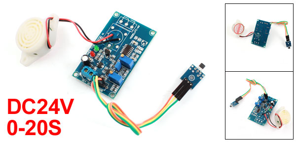 Product Name Delay Alarm Module Working Voltage DC 24V Delay Time 0-20S(0-200S) Fixing Hole Dia 3mm/0.12" Fixing Hole Center Distance 58 x 33mm/2.3" x 1.3"(L*W) Total Size 6.4 x 3.9 x 1.2cm/2.5" x 1.6" x 0.47"(L*W*H) Wire Length 22cm/8.7" Materials PCB Main Color Blue Net Weight 24g Package Content 1 x Delay Alarm Module