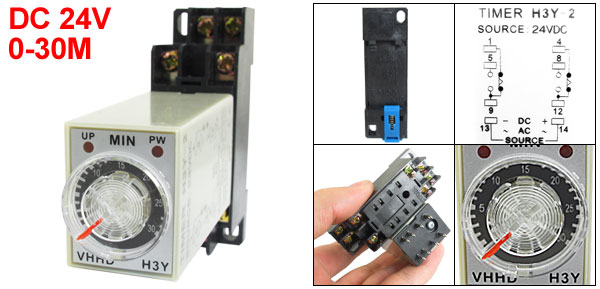 Product Name Time Relay + Socket Type H3Y-2 Contact Type DPDT Source DC 24V Contact 5A 250VAC Resistive Load Time Range 0-30 Minutes Number of Terminals 8 Mount Rail Type 35mm DIN Rail Fixing Mount Hole Size 6 x 4mm/ 2.4" x 0.15"(L*W) Fixing Mount Center Hole Distance 57 x 15mm/2.2" x 0.6"(L*W) Total Size (Approx.) 68 x 22 x 88mm/ 2.7" x 0.9" x 3.5"(L*W*H) Color Black, Gray Net Weight 67g Package Content 1 x Time Relay